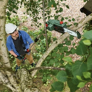De Bosch accu hoogsnoeier UniversalChain 18 is ideaal voor het snoeien van moeilijk bereikbare takken. Door de verstelbare kop en telescoopstang van 2,1 tot 2,6 meter hoog, zaagt deze machine moeiteloos door zelfs de hoogste takken. De tipbeschermer en bumperspike zorgen voor een betere controle. De ketingzaag werkt op een 18V / 2,5Ah Lithium-Ion accu, waardoor u gelijk aan de slag kunt zonder het gebruik van verlengsnoeren. Door het ergonomische, goed gebalanceerde en lichtgewicht design werkt u probleemloos en langdurig door zonder belasting op de armen en schouders. Met het zwaard van 20 cm snoeit u takken met een dikte tot 15 cm. Door de oliepeilindicatie en automatische kettingsmering wordt er voorkomen dat uw machine droogloopt.