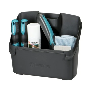 De Gardena onderhoudsset voor robotmaaiers bevat een reinigingspad tegen vuil, twee verschillende borstels, een reinigingsspray en een speciale schroevendraaier om bijvoorbeeld zelf de messen te vervangen van je maaier.